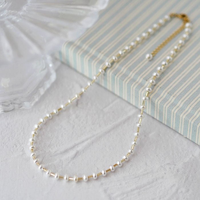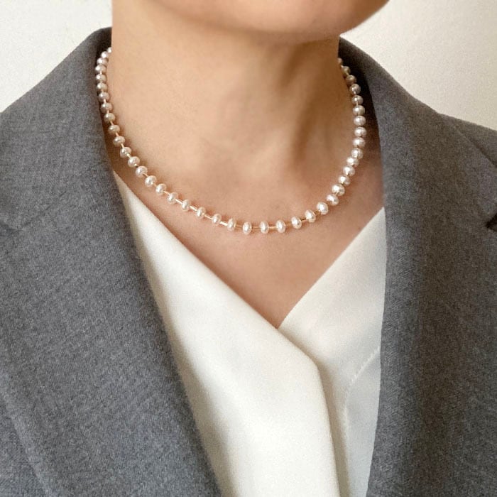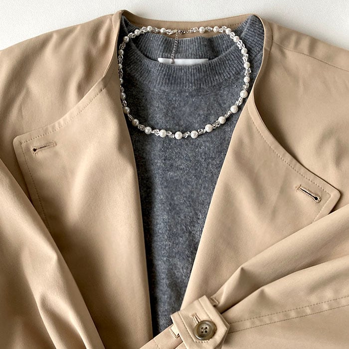 首回りにしなやかに弧を描くいてくれるナイロンコートワイヤーに通して仕立てるネックレスです。