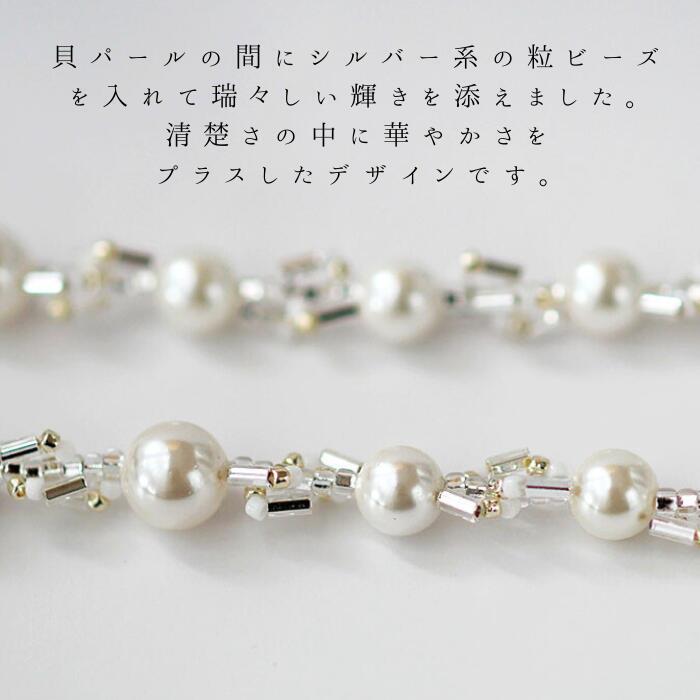 貝パールの間にシルバー系の粒ビーズを入れることで瑞々しい輝きを添えました。