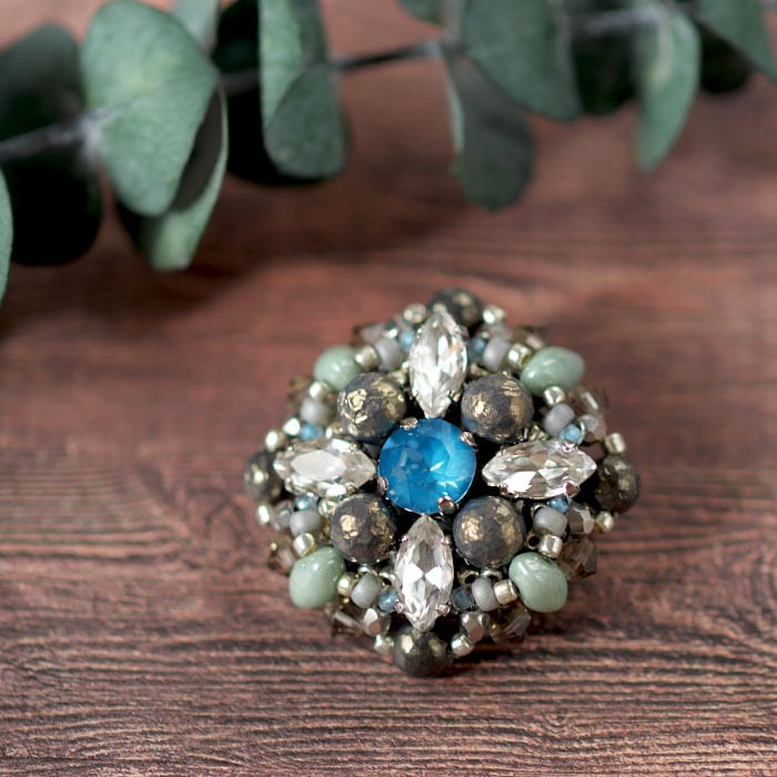 マーキス型のガラスビジューやしわ加工のほどされたパール、チェコビーズなどを重ね、