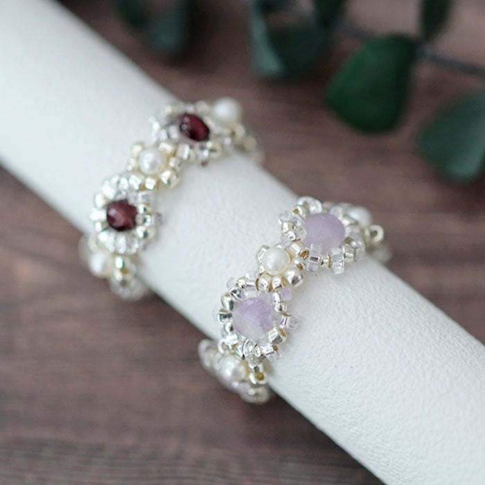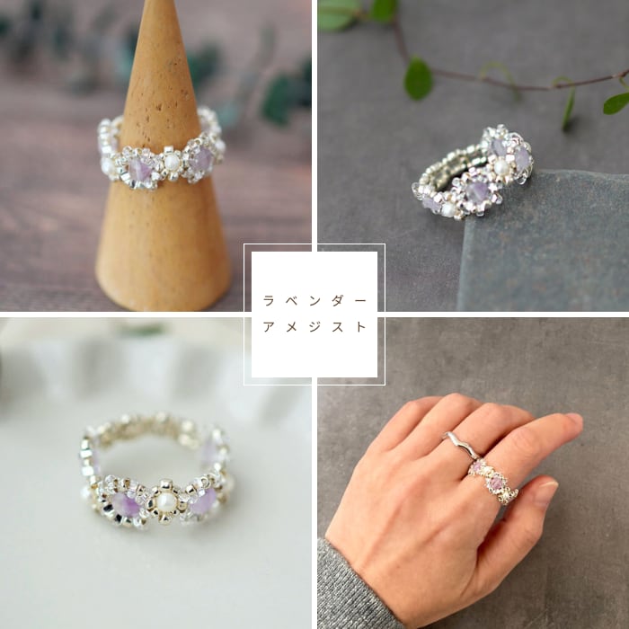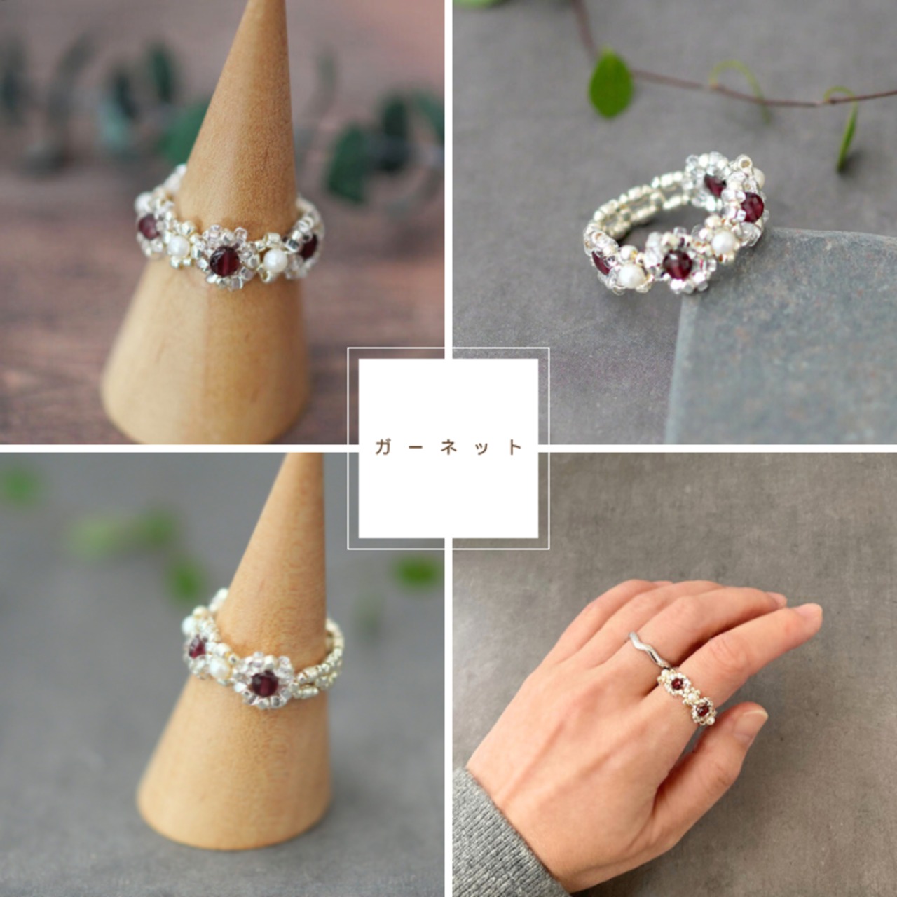天然石と淡水パールをシルバーの粒ビーズと編みあげるリングです。