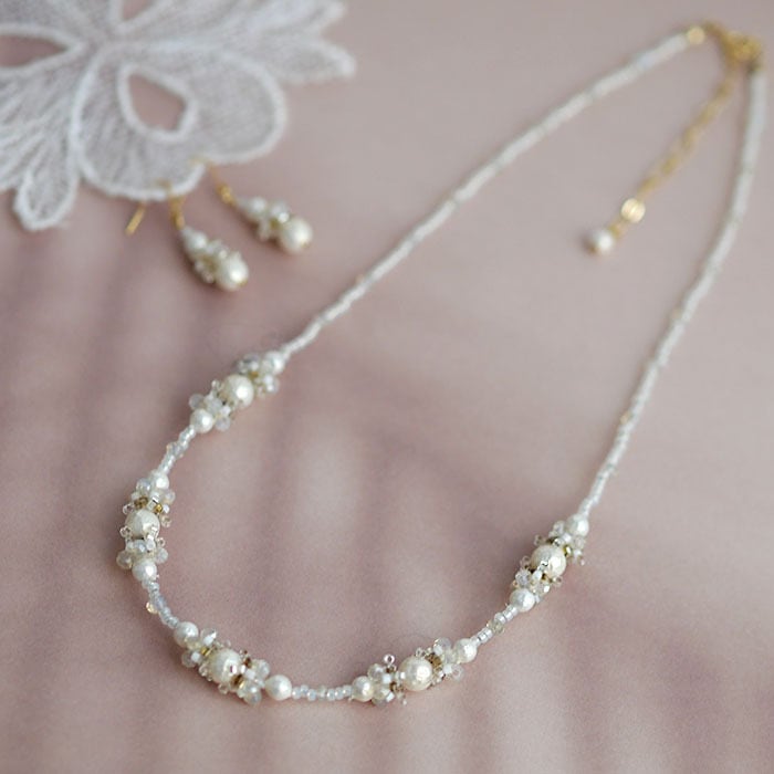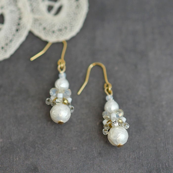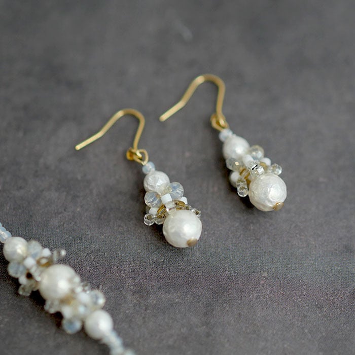 ワントーンですが、いろんな風合い・輝きの白いビーズをミックスしており、 じっと見ていたくなるような可愛いピアスです。
